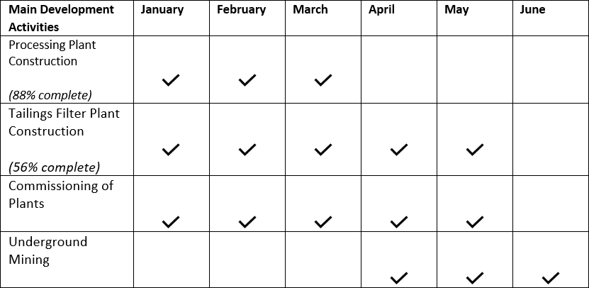 - Ongoing refurbishment and readiness work at the surface infrastructure at Wardner in preparation for commissioning activities.