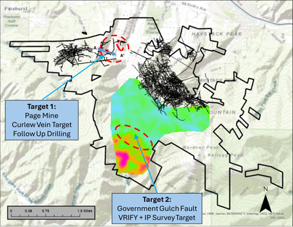 - Target 1: Page Mine-Curlew Vein. This target, located within the recently acquired Ranger-Page property, is based on data from a 2025 drilling campaign that discovered higher-grade silver, lead, and zinc mineralization in a splay of the previously mined Curlew Vein at relatively shallow depths and not explored by prior operators. See the October 27, 2025, release here.