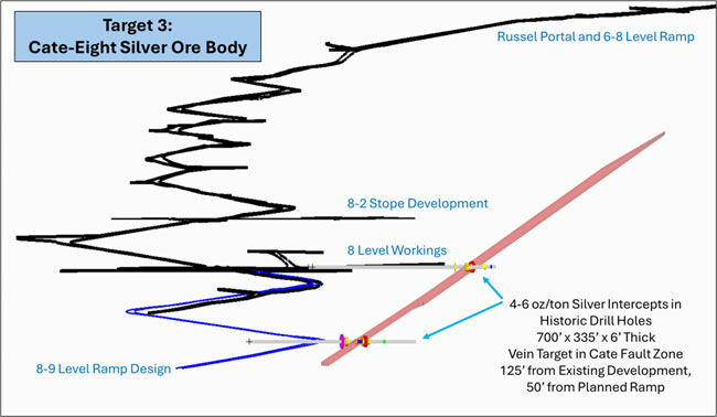 - Target 3: Cate Fault Zone Silver Mineralization in Historic Drilling. Drilling in the 1970s in the Bunker Hill Mine identified a zone of high-grade silver-lead mineralization within the Cate Fault zone, which was never exploited. This zone is in close proximity to current and planned mine development, with a predictable geometry following the Cate Fault. Drill intercepts are within 125 feet of the rehabilitated 8 Level, and within 60 feet of the planned 8-9 Level ramp, providing two access points within a distance amenable for efficient exploration by drifting.